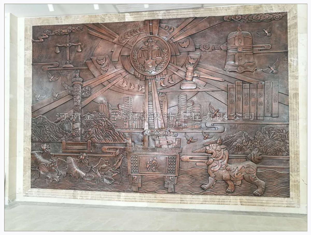 法院背景墻浮雕因?yàn)檠b飾需求,大堂浮雕墻在法院背景墻浮雕的裝飾中運(yùn)用較多,浮雕質(zhì)感古樸典雅,大方美觀,